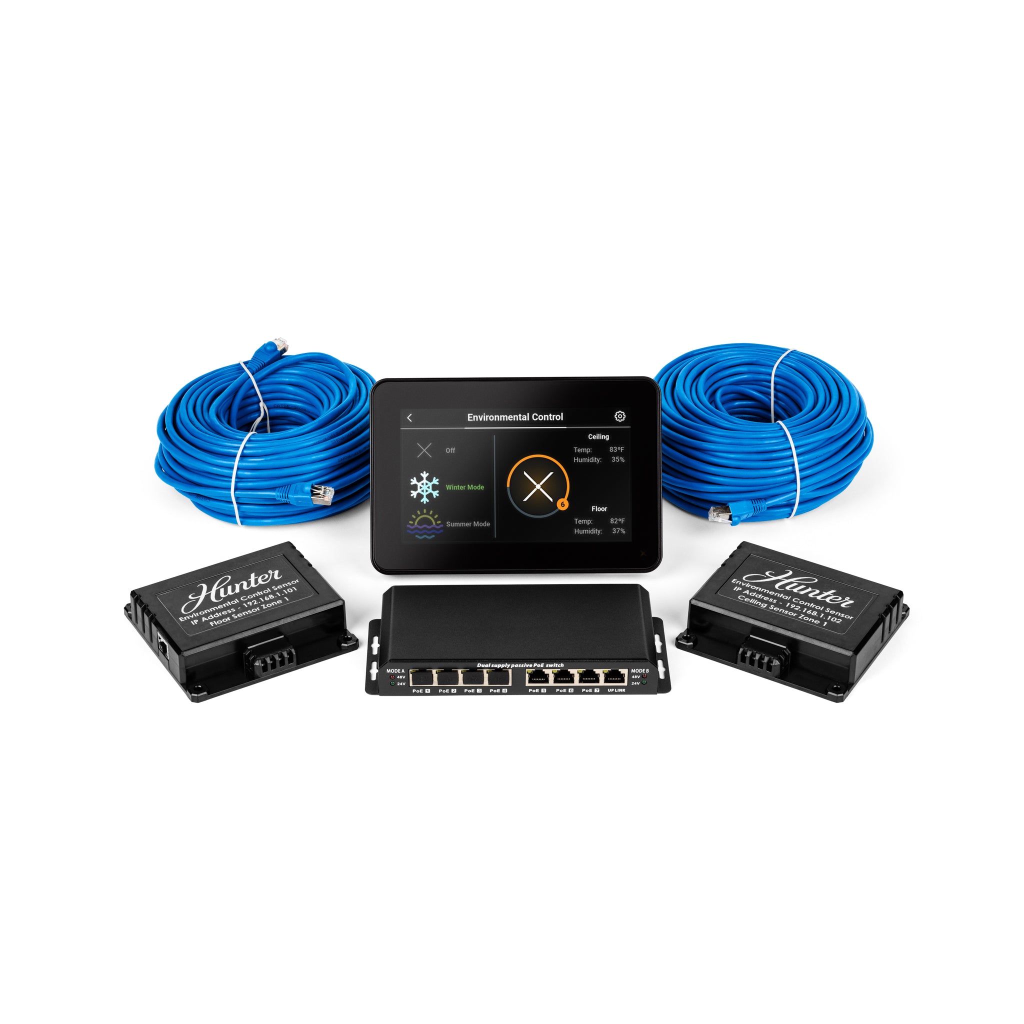 Includes: 700E Wall Controller with the Zone Environmental kit allows your 700E Wall Controller to adjust your fans' settings automatically based on local temperature and humidity levels in zones, includes 2 Cat 5 Cables, 2 Environmental Sensors, and the POE Network Switch.