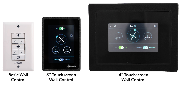 Trak Wired fans feature three control options. The Basic Wall Control is a tactile switch that allows users to control up to 5 fans, with an LED bar that indicates speed and brightness. The 3” Touchscreen Wall Control increases the number of controllable fans up to 10. To unlock the true potential of Trak Wired, we offer the 4” Touchscreen Wall Control, which allows you to control up to 30 fans from one location, with individual fan and lighting controls, and advanced fan scheduling and zoning features.